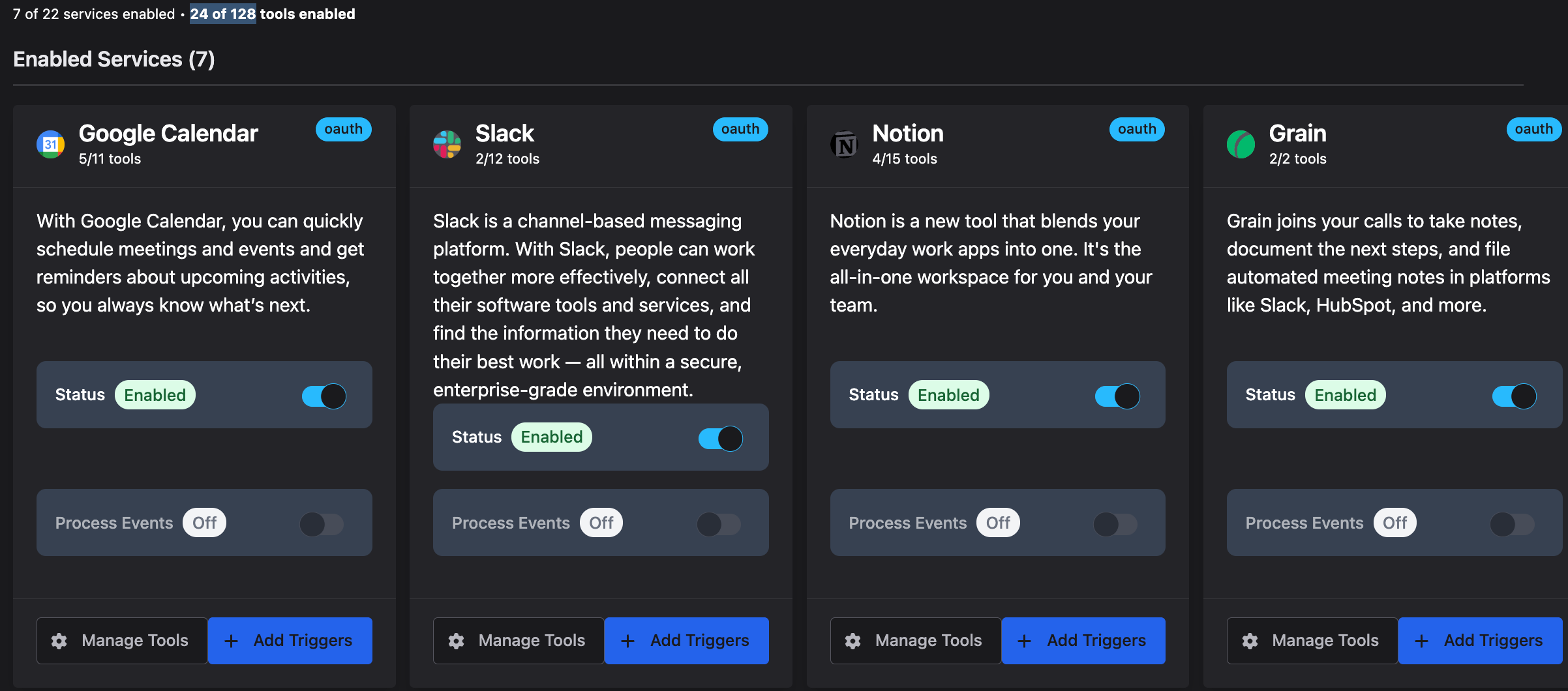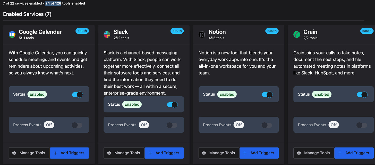 A more effective strategy is to curate specific tool calls from various sources and expose them as one cohesive MCP server, complete with tailored names and descriptions for enhanced efficiency and reliability. Toolbelt makes this straightforward. For example, I've configured an MCP server for comprehensive meeting preparation, drawing from seven services. Rather than overwhelming the client (like Claude, Windsurf, or Cursor) with 128 raw tools, it exposes just 24 curated ones through a single tool—streamlining access without compromise.